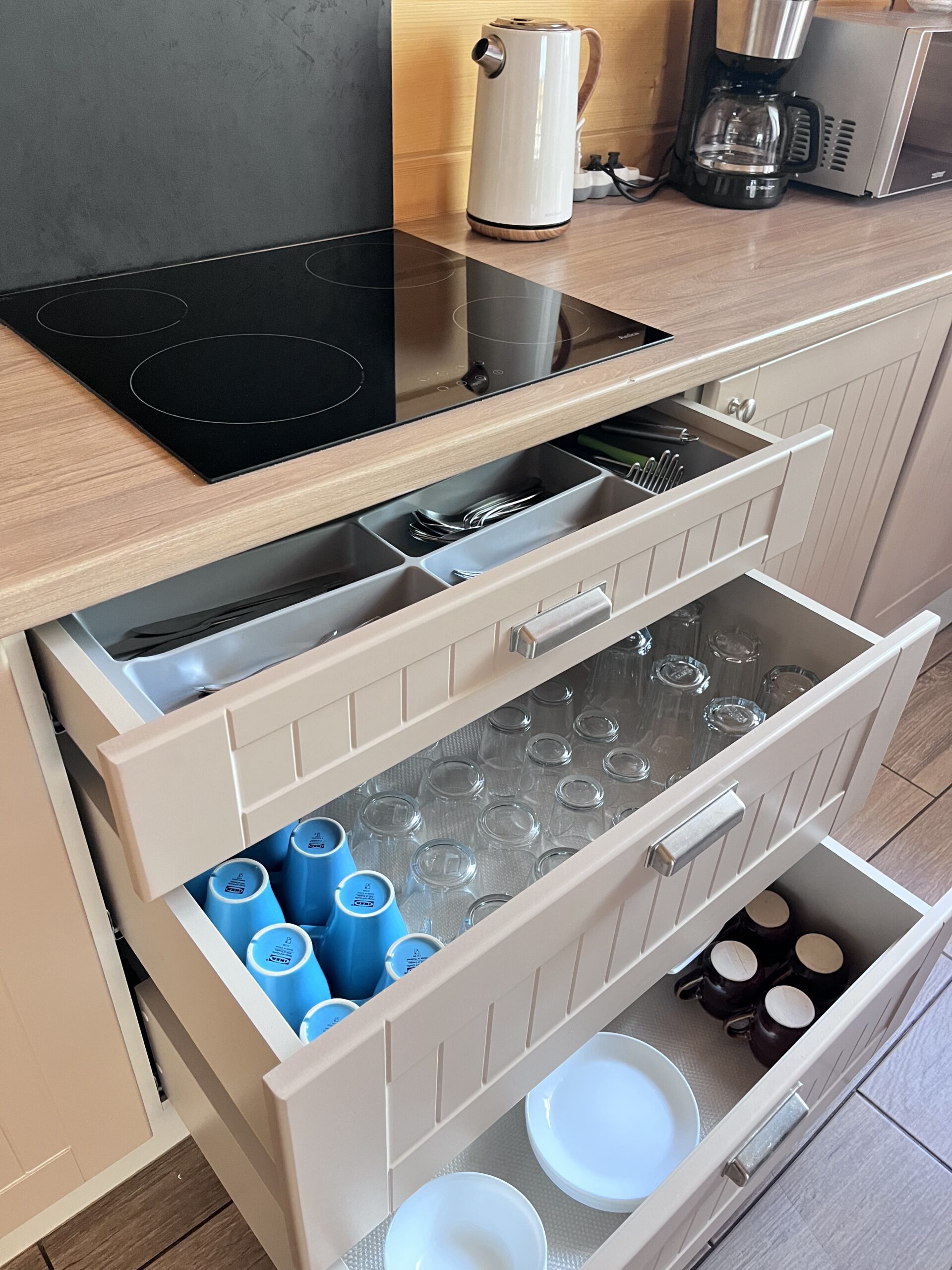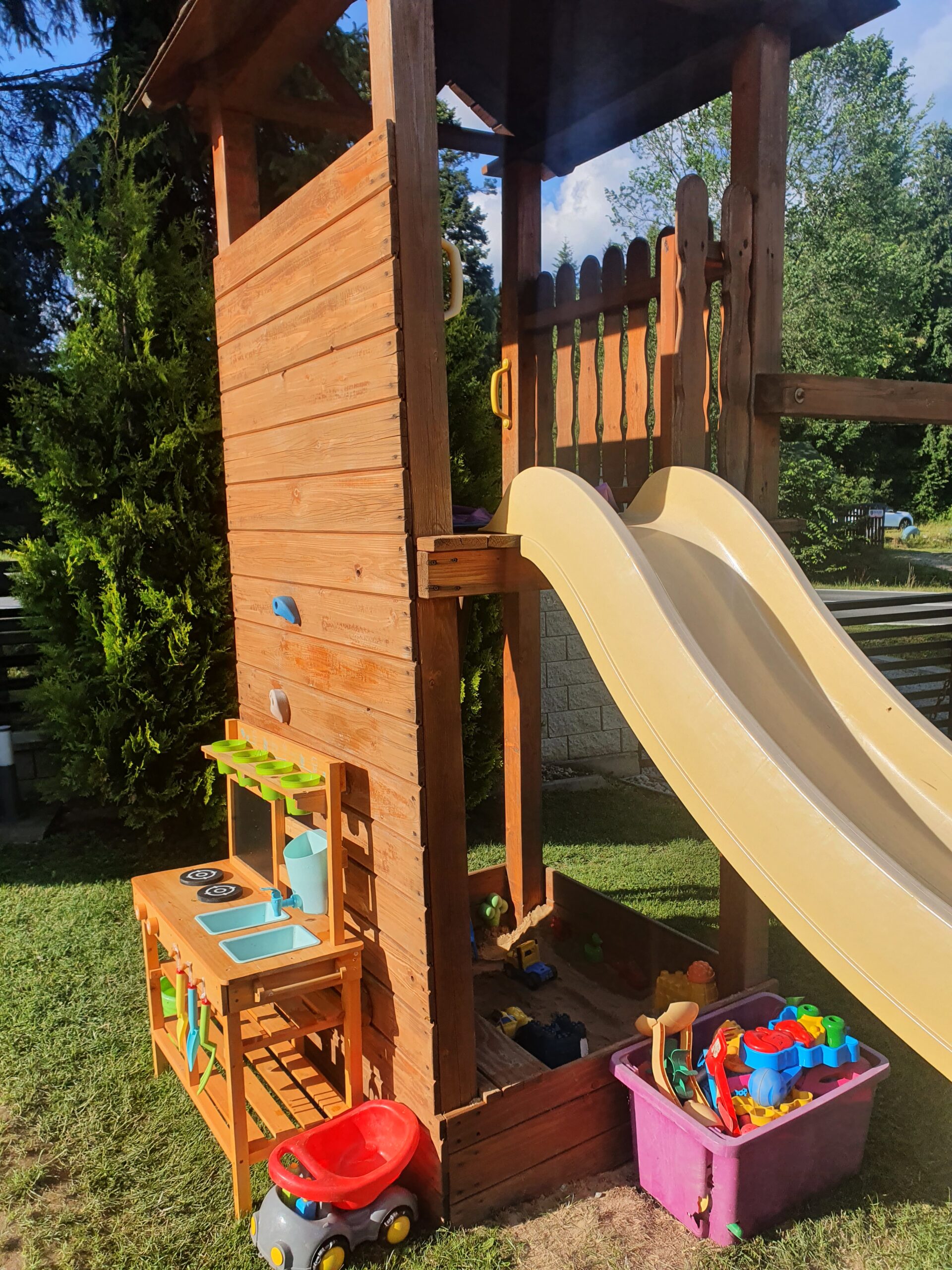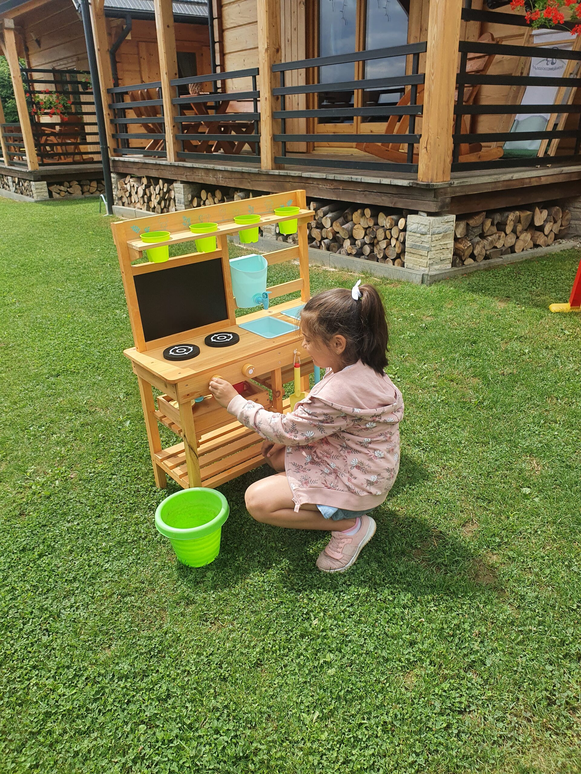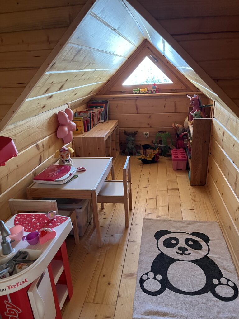 W tym domku najmłodsi mają swój pokoik zabaw – przestrzeń, gdzie mogą się bawić, śmiać i spędzać czas po swojemu. W tym czasie rodzice mogą zwolnić tempo, napić się kawy lub porostu odpocząć.
